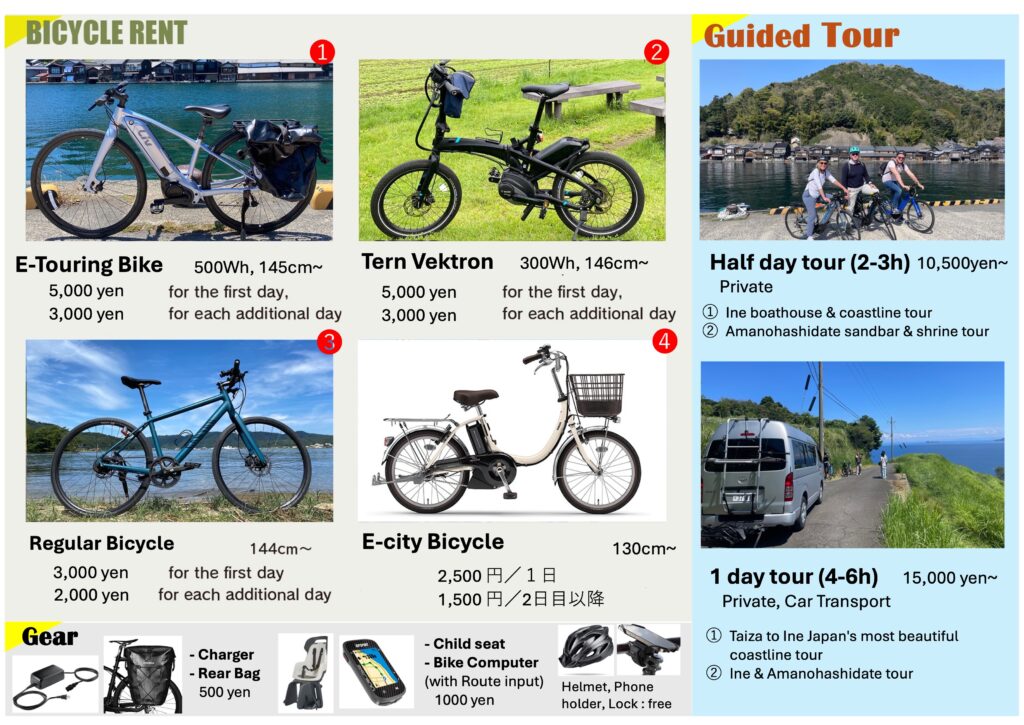 私たちの故郷、丹後半島で3つの提携店があります。こちらでも是非E-Bikeをレンタルしましょう!
