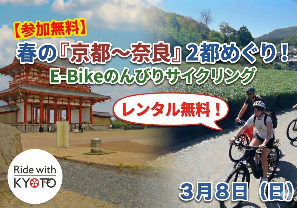 【参加無料、先着30名】3/8(日)開催!最新E-Bike(電動スポーツ自転車)を片道無料レンタルして、京都「さくらであい館」から奈良「平城宮跡」まで約30kmの春風サイクリング。初心者も安心の自転車専用道がメインです。手ぶらで絶景と歴史の2都めぐりを楽しもう!詳細・申込は以下をクリック!